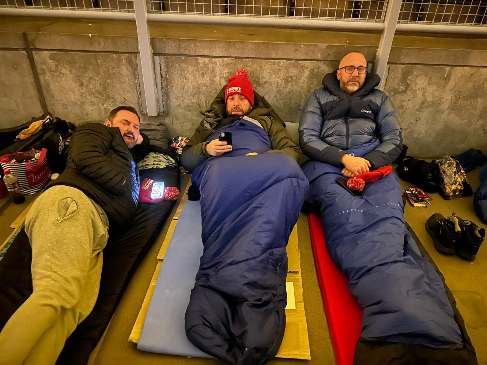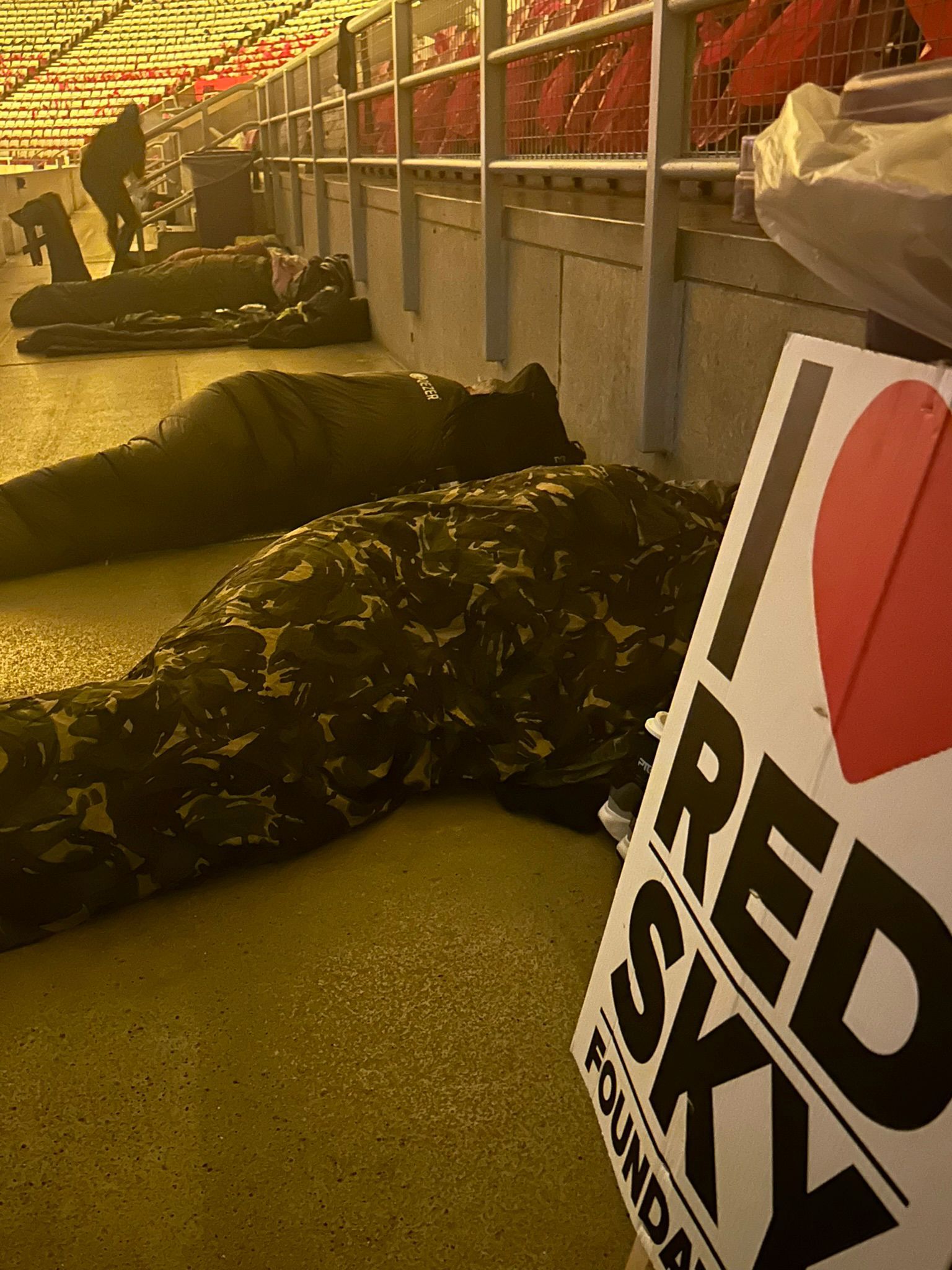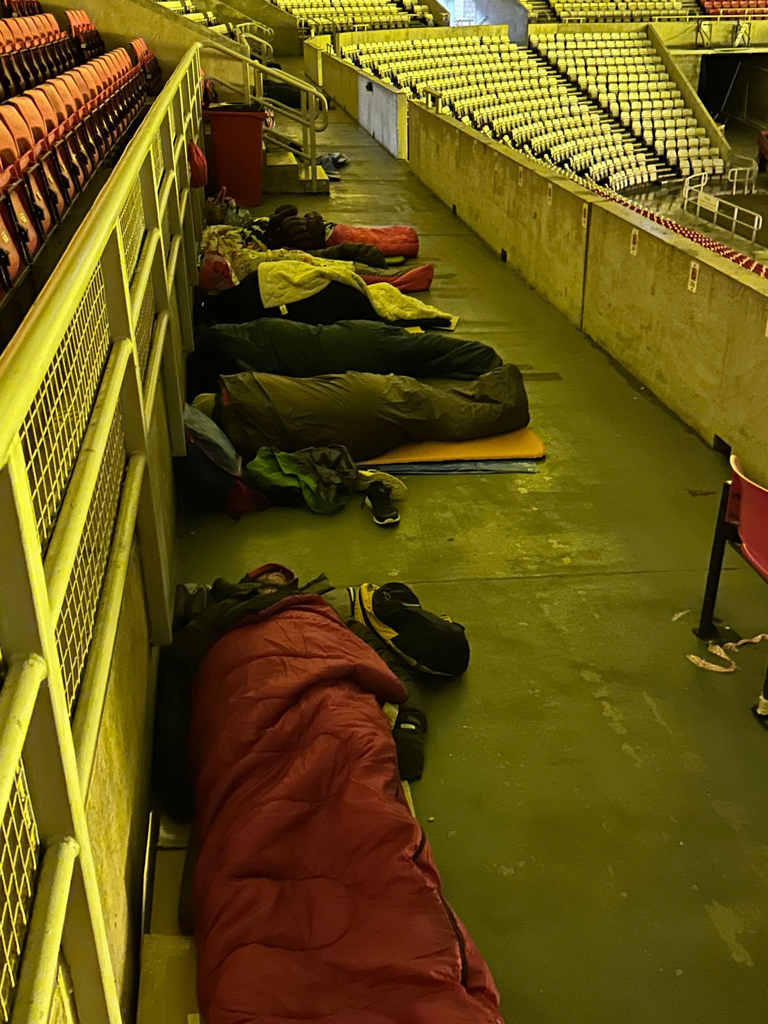“Well, we all did it — slept from about 1:30am until 5am. A little bit of rain early in the night and woke up to howling wind around the stadium. Back, neck — well, full body — is aching, but we stayed warm. At least we were safe in this environment; I would hate to be really vulnerable on the streets in winter.”