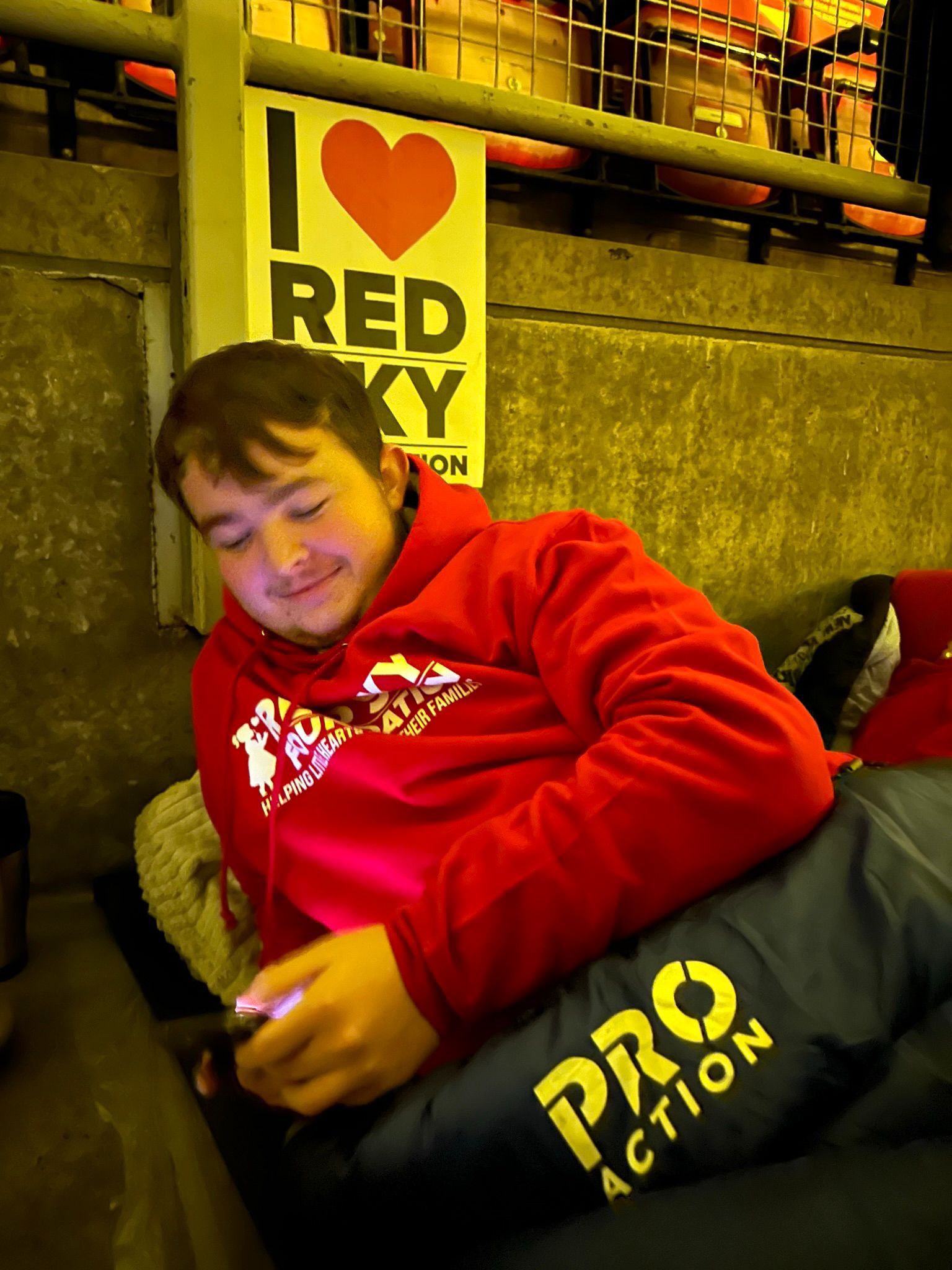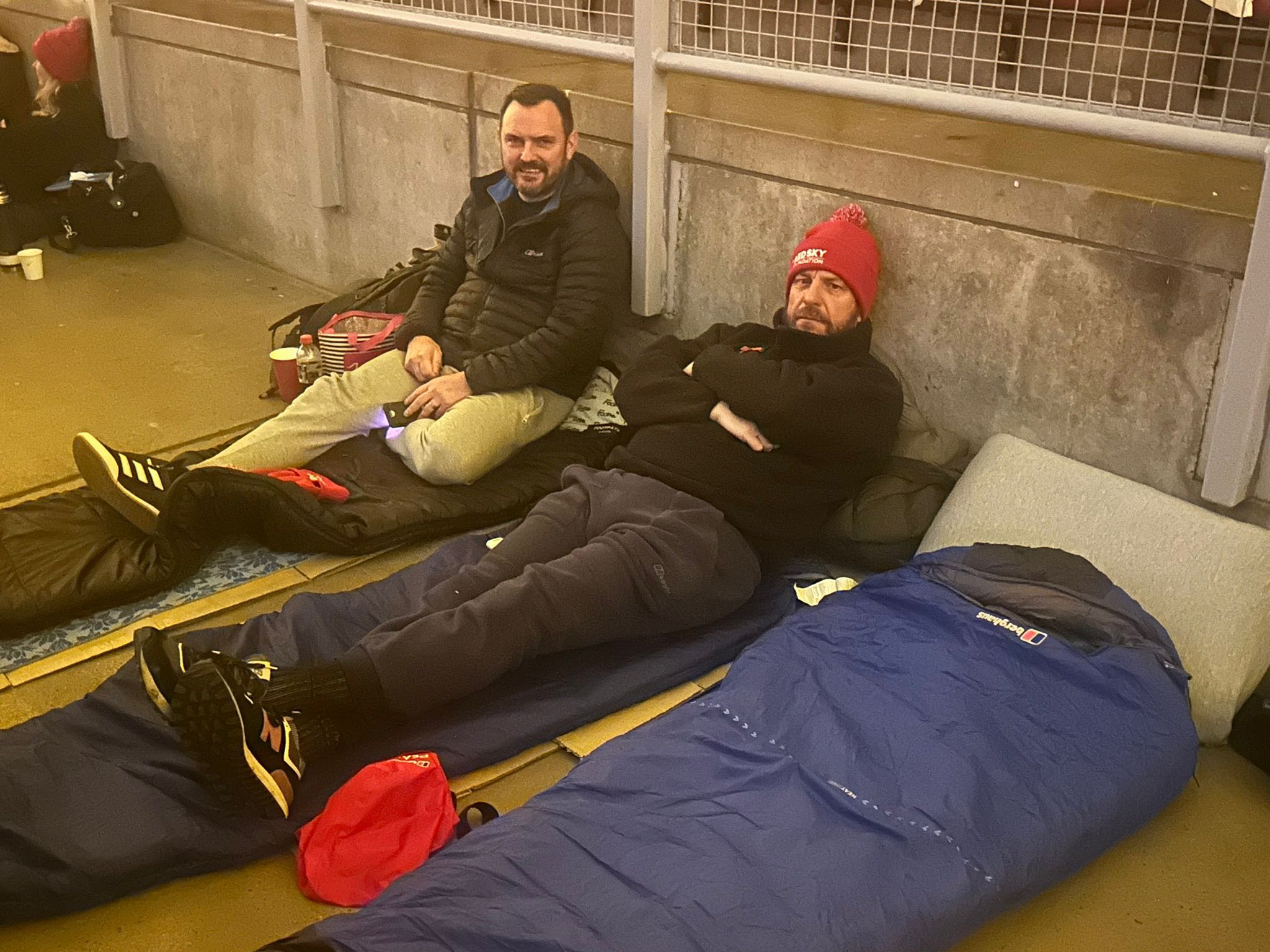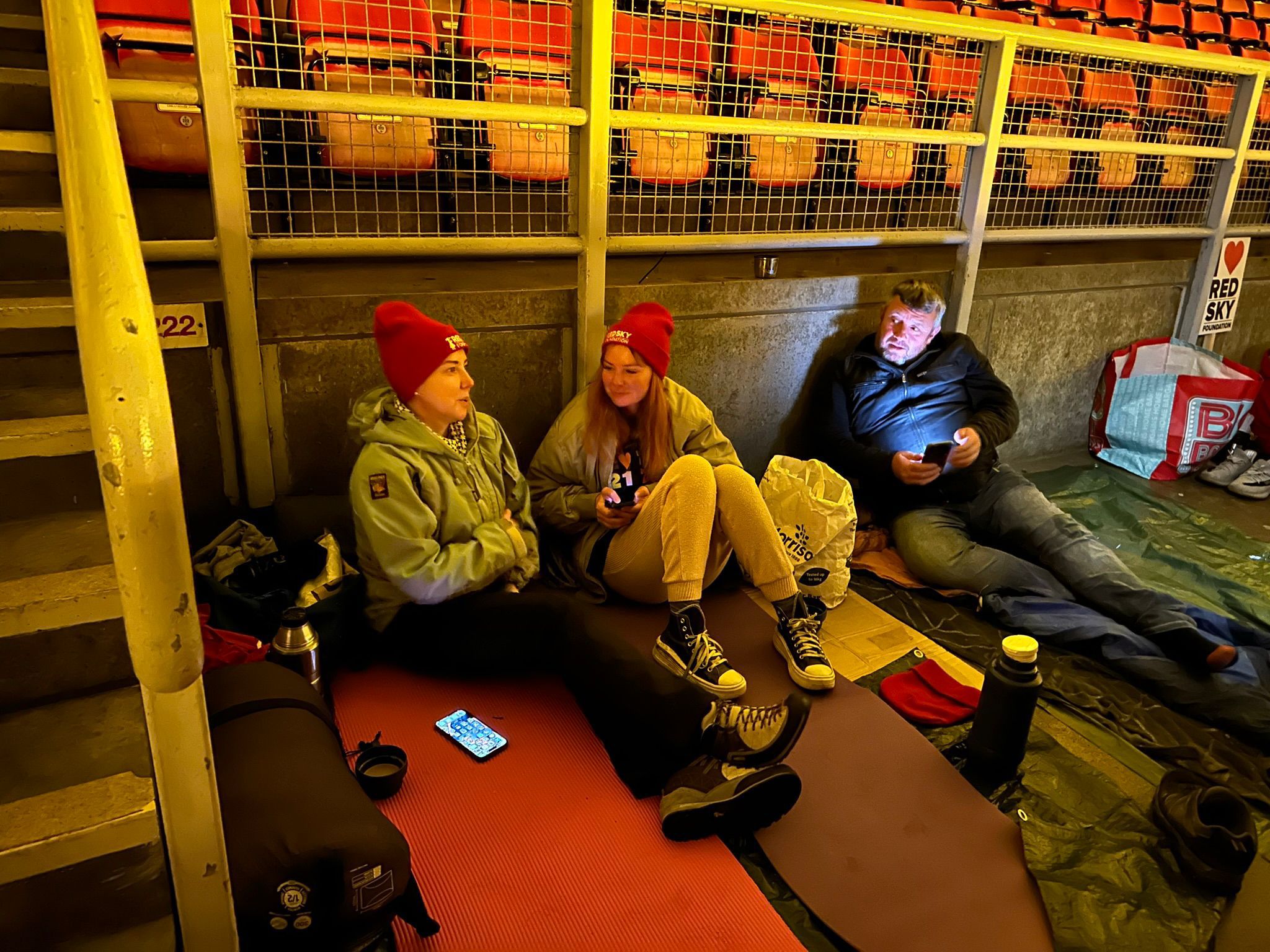 “Well, we all did it — slept from about 1:30am until 5am. A little bit of rain early in the night and woke up to howling wind around the stadium. Back, neck — well, full body — is aching, but we stayed warm. At least we were safe in this environment; I would hate to be really vulnerable on the streets in winter.”
